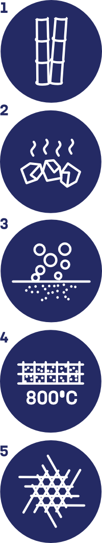 Bambua kuumennetaan 800°C:seen seitsemän päivän ajan mineraalirikkaan hiilen luomiseksi. - Jauheeksi murskattu
